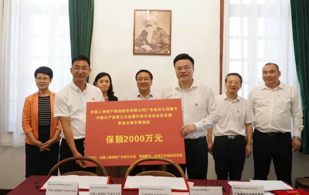 8月30日,省文化和旅游厅、省地方金融监督管理局、中国人寿财产保险股份有限公司广东省分公司(以下简称中国人寿财险广东省分公司)联合在中共中央机关旧址春园签署向广东省革命文物捐赠保险协议书并举办捐赠仪式。省文化和旅游厅副厅长、省文物局局长曾颖如,省地方金融监督管理局副局长倪全宏,中国人寿财险广东省分公司总经理费剑锋等参加活动,并邀请省党史学习教育巡回指导组领导见证。本次活动共向全省135处省级以上革命文物保护单位捐赠3年公众责任险和财产综合保险,共计提供风险保障金额49.5亿元。在活动现场,中国人寿财险广东省分公司向受捐单位代表中共三大会址纪念馆进行了捐赠仪式。
